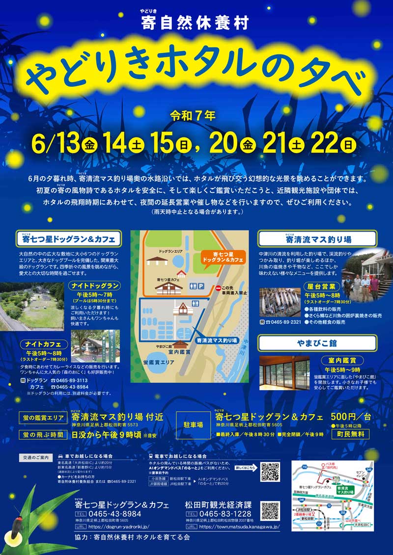 寄の初夏を彩る風物詩・ホタルを、安心して楽しくご覧いただけるよう、近くの観光施設や地域の団体では、ホタルが飛ぶ時期にあわせて夜の営業時間を延長したり、さまざまなイベントを開催予定。この季節だけの特別なひとときを、ぜひ寄でお楽しみください。