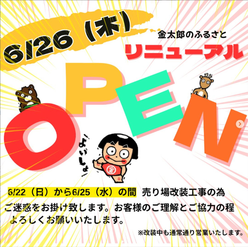 金太郎のふるさとでは6/22(日)〜6/25(水)の間、売り場改装工事のため、売り場スペースが狭くなり、また、農産物の出荷量が少なくなります。
