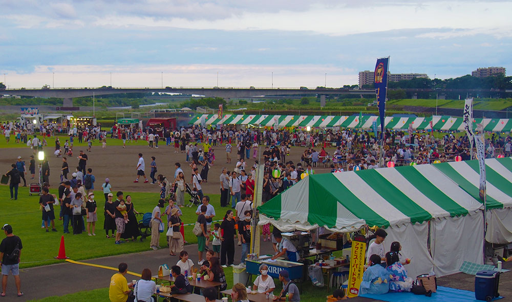 開成町・松田町の酒匂川の両岸を中心に、屋台や音楽フェスティバル、いろいろなイベントが開催され、また今年、開成町は町制施行70周年、松田町は寄村と合併し70周年の節目を迎えたことなどを記念した花火大会として、例年より多い約1400発の花火が足柄の夜空を彩ります。