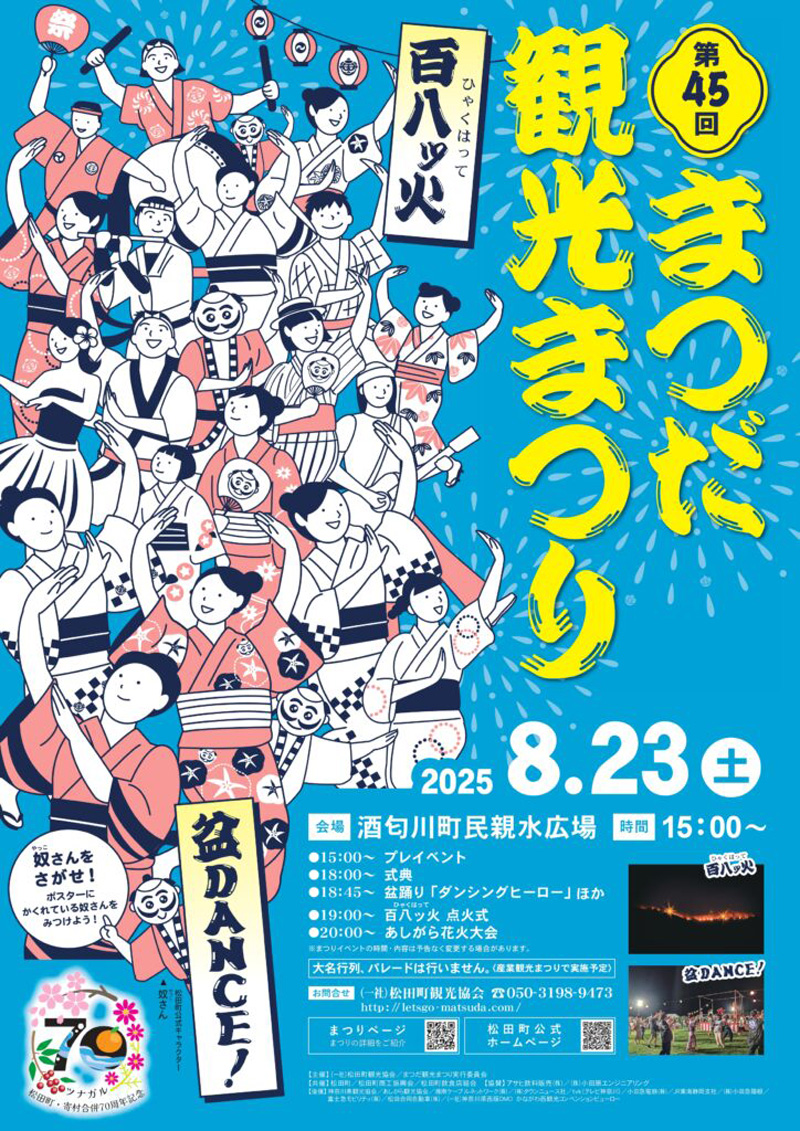 • ライブやダンスのステージイベント、松田音頭や炭坑節、ダンシングヒーロー(盆踊りVer)で盆踊りを踊って楽しめる「まつだ観光まつり」。
