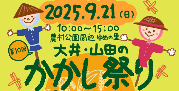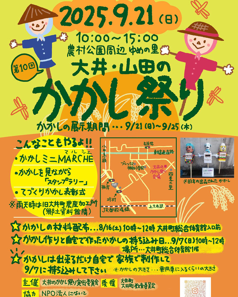 9/21(日)「大井・山田のかかし祭り」では、出品されたかかしの展示や作品の表彰式、ミニマルシェ、スタンプラリーなども予定しています。