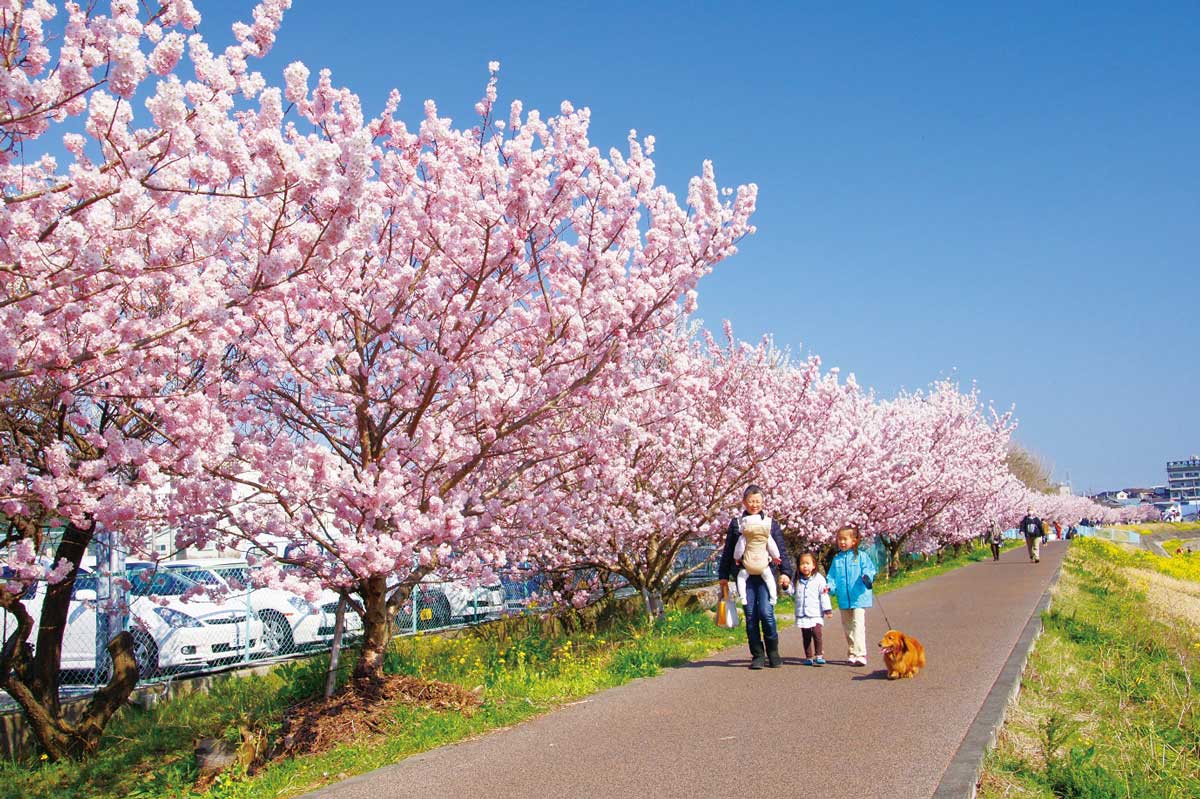 狩川土手沿い両岸に植えられた「春めき」は、見頃を迎えると多くの観光客で賑わう観光スポット。